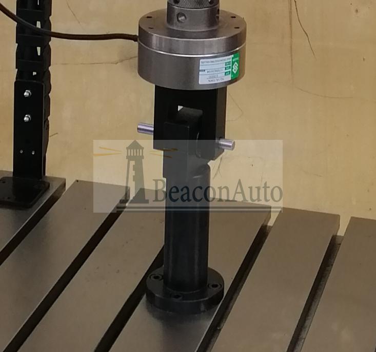 扭矩傳感器測(cè)量系統(tǒng)位于臺(tái)面右側(cè),襯套工裝位于臺(tái)面之上連接傳感器和擺動(dòng)缸之間,襯套通過(guò)支架與扭矩傳感器法蘭連接,從而測(cè)量試件扭轉(zhuǎn)時(shí)內(nèi)套和外套的相對(duì)角度。扭矩加載由擺動(dòng)缸通過(guò)計(jì)算機(jī)程序控制來(lái)實(shí)現(xiàn),扭矩加載通道安裝在移動(dòng)滑臺(tái)上,可根據(jù)工件大小,可做前后移動(dòng),便于裝夾試件。