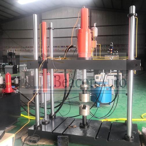 試驗(yàn)機(jī)主要由一臺(tái)主機(jī)(上置400kN伺服直線作動(dòng)器)、液壓夾頭及其液壓驅(qū)動(dòng)模塊、一套恒壓伺服泵站(流量70L/min、系統(tǒng)壓力21MPa)、全數(shù)字單通道伺服控制器以及計(jì)算機(jī)打印機(jī)、相關(guān)試驗(yàn)軟件、其它必要的附件等組成。